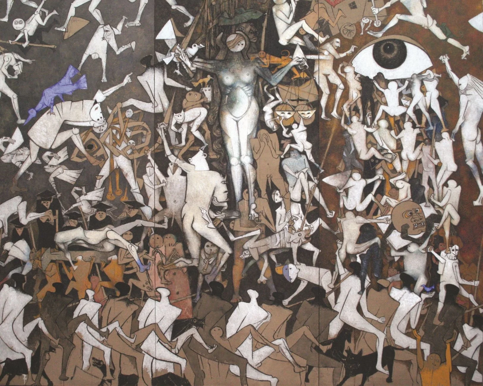 Complex figurative composition using layered paint and precise drawing. Contrasting tones and overlapping bodies create an allegorical scene exploring justice and disorder.
