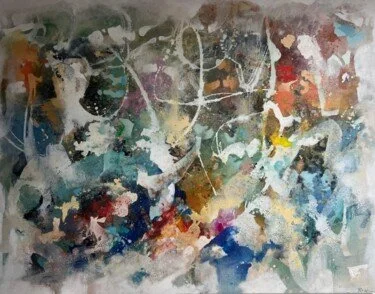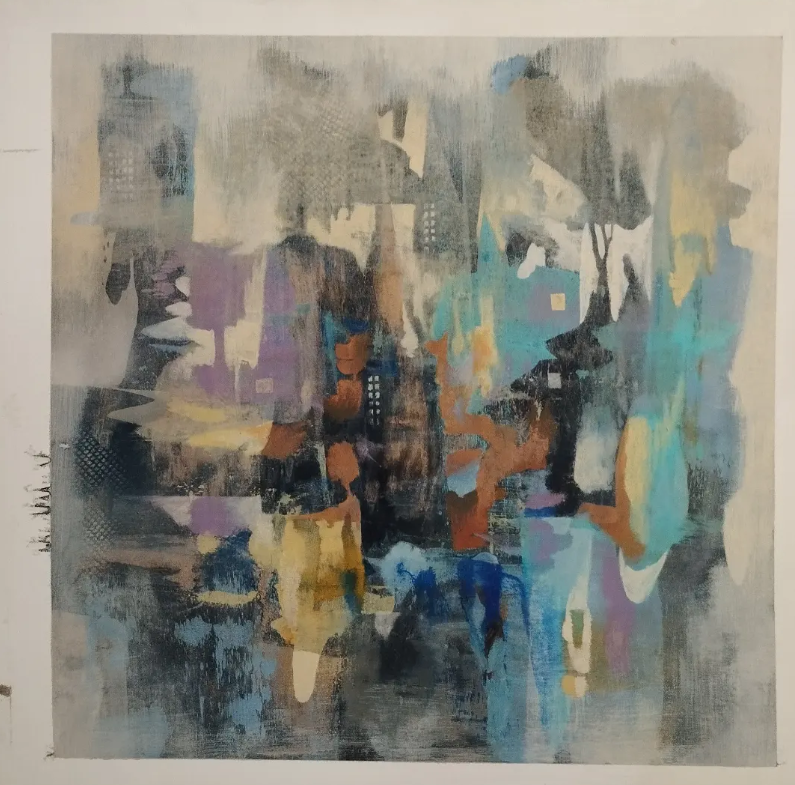 Mixed media composition with layered textures and muted tones. The work suggests an abstract landscape through gestural marks and subtle color transitions.