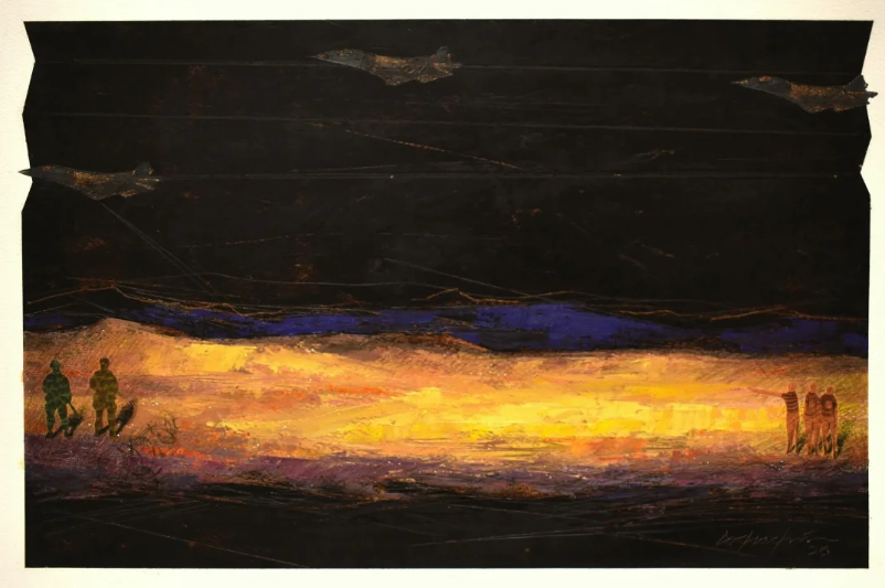 Oil and pencil on cardboard with a dark atmospheric palette. Through layered marks and subtle figures, the work reflects themes of displacement and human presence within the landscape.