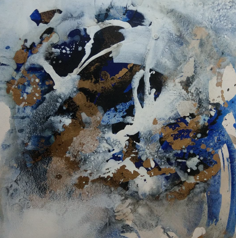Dynamic abstract composition using fluid paint techniques and contrasting pigments. The layered splashes and organic forms emphasize movement, texture and material experimentation.