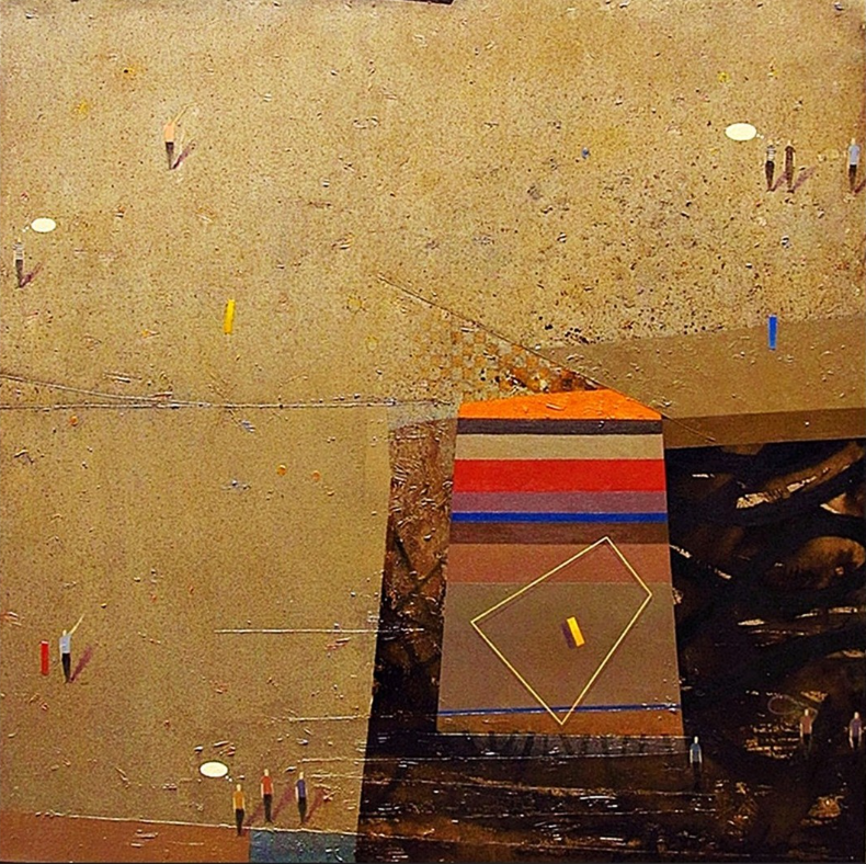 Oil on canvas with earth tones and interlocking figures. The structured composition combines expressive linework with symbolic references to urban life.