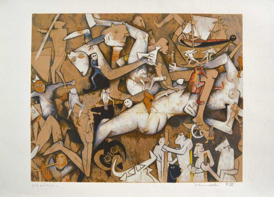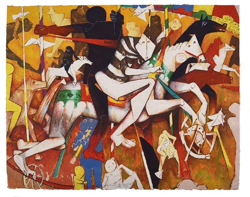 Oil on canvas composition with fragmented figures and vibrant colors. Chávez uses dynamic brushwork and angular forms to evoke movement and a surreal festive atmosphere.