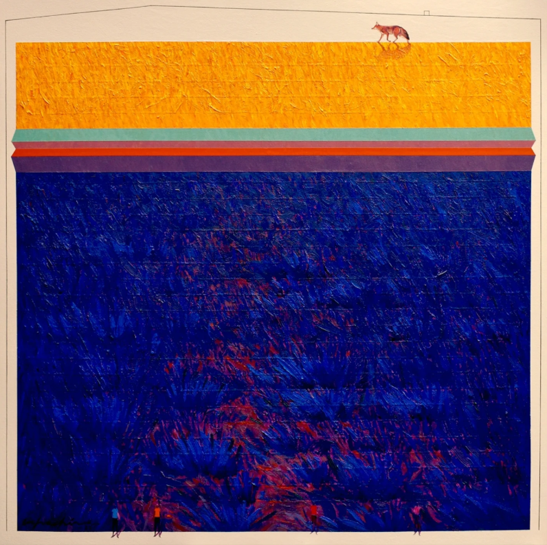 Oil on canvas structured through horizontal color fields and strong chromatic contrast. The composition evokes landscape through abstraction and atmospheric depth.