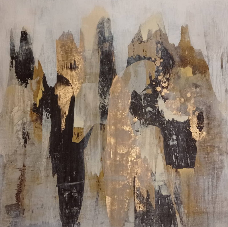 Mixed media on canvas combining vertical forms, textured surfaces and metallic tones. The composition explores balance between abstraction, materiality and spatial depth.